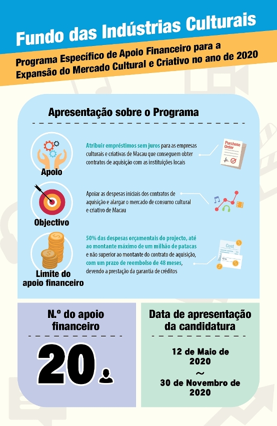 因应新冠肺炎疫情对文创企业造成的影响,文化产业基金推出“文创市场拓展专项资助计划”,向成功取得本澳机构文创采购合约的企业,提供最多20个免息贷款的资助名额,支持企业开拓澳门的文创消费市场。