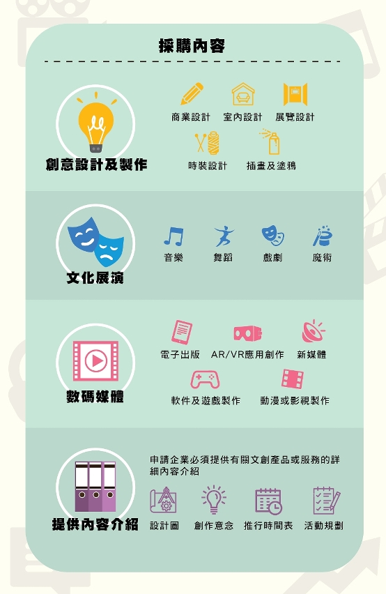 采购内容包括创意设计及制作、文化展演、数码媒体的原创产品或服务。采购机构必须为本澳政府部门、合法注册登记的公共事业机构、金融机构、电讯网络及电视广播机构、航空企业、星级酒店、本澳学校、高等院校,或在财政局作A组纳税人登记的机构。