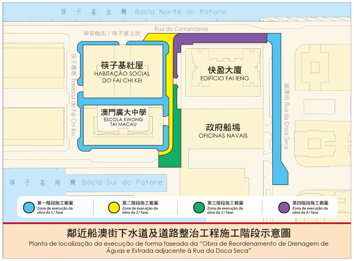 至于第二阶段,工程将在靠近快富楼及广大中学一边的一段筷子基街行车路面施工;第三阶段施工位置则为靠近快盈大厦与政府船坞一边的一段筷子基街行车路面;而第四阶段施工位置为筷子基街与船澳街之间告近快盈大厦的一段俾若翰街行车路面。