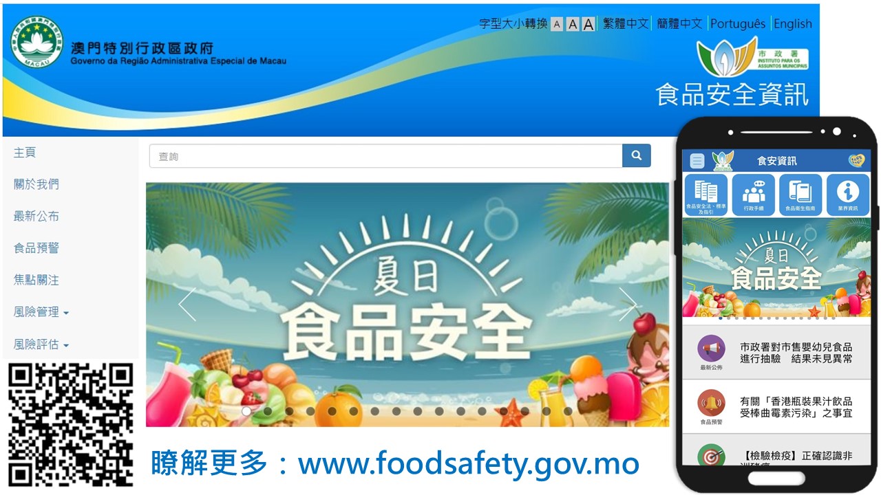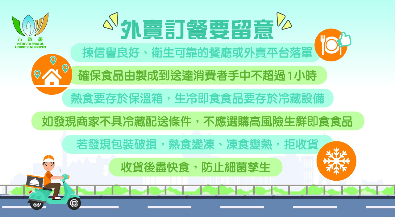 市政署已于食品安全资讯网www.foodsafety.gov.mo设置了「夏日食品安全」专页及「【精明消费】外卖订餐要注意」专页,欢迎市民及业界登入网站浏览,获取更多食安资讯。