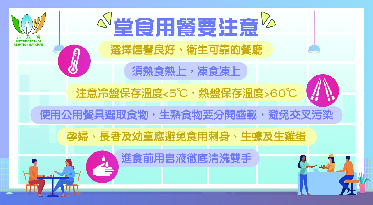 市民外出用膳时,要光顾持牌、信誉良好、卫生可靠的食肆;用餐期间留意上菜时食品的温度,如「热食热上」,「冻食冻上」,否则意味着食品可能长时间置于室温中,或贮存在不当温度下,有孳生微生物的风险;若发现异味就不应进食,并通知餐厅员工作出处理。另外,在享用自助餐时,留意冷盘展示温度要低于摄氏五度;热盘则应保存在摄氏六十度以上;取用食物时宜把生冷食物和熟食分开选取及盛载,以免造成交叉污染。尤其,进食未彻底煮熟的水产或蛋类食品,存有一定风险,孕妇、长者及幼童应尽量避免食用。市民应注意个人卫生,进食前应用皂液彻底清洗双手,避免用手直接拿取食物,建议使用公筷及公匙。