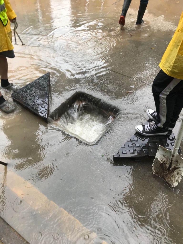 因应强降雨时间持续,渠道积聚大量雨水,新桥、台山、内港及氹仔旧城区相继出现水浸现象,其中台山超过180毫米降雨。而因海潮高度达2.1米,减低了雨水渠的排洪能力。为此,市政署即时启动暴雨应变机制,派员到各雨水泵房巡查,开启水泵以排洪。同时,分别派员及要求外判清渠公司往低洼地区进行紧急清理路边雨水井工作,清走积聚渠口垃圾,打开渠盖加快排洪。