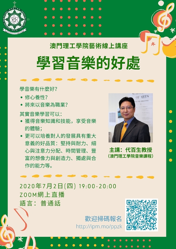 为加强学生及市民的音乐鉴赏能力,提升文化艺术素养,澳门理工学院推出线上艺术讲座,由教学经验丰富的音乐课程教授代百生为市民分享“学习音乐的好处”,通过丰富的事例和生动的讲解带给学生及市民对音乐学习的一些新认识。