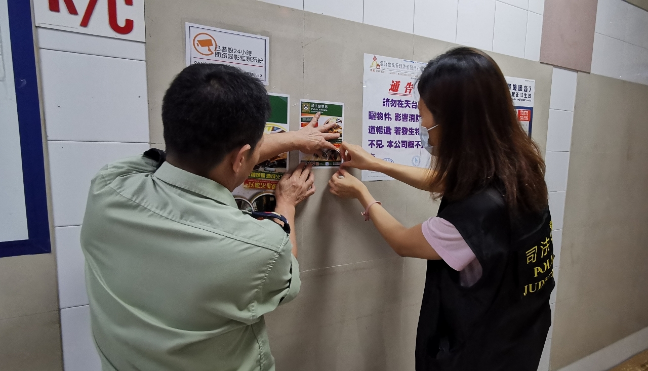 因应近期先后发生有人丢弃未熄灭烟蒂引致火警的案件,为加强市民的守法意识和防火警觉性,司法警察局于6月初展开“预防纵火犯罪”专项宣传工作,派员走访社区、特别是过往曾发生过纵火案的住宅大厦,向市民讲解过失引致火警的刑责,令市民尤其是吸烟者提高警惕,防止纵火案发生。