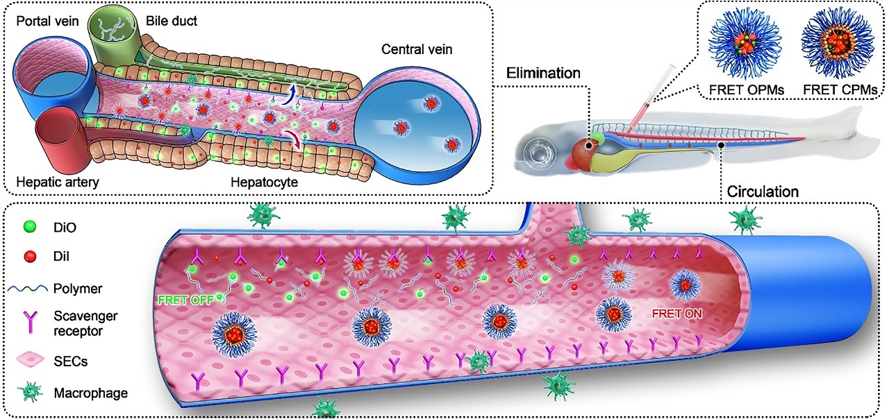 近年来,医药界涌现了大量的纳米载体系统(纳米药物),而成功实现临床转化的产品却寥寥无几,主要原因是缺乏对纳米药物载体体内行为及作用机制的瞭解。由于光(可见光和萤光)很难穿透较厚的组织,纳米药物在啮齿类动物体内的追踪受到了其光学成像的严重限制。团队采用透明斑马鱼动物模型结合Förster能量共振转移萤光成像技术,实现了完整聚合物胶束纳米粒的体内量化和可视化追踪,从整个机体水准和细胞分子水准揭示了聚合物胶束的体内行为和清除机制。