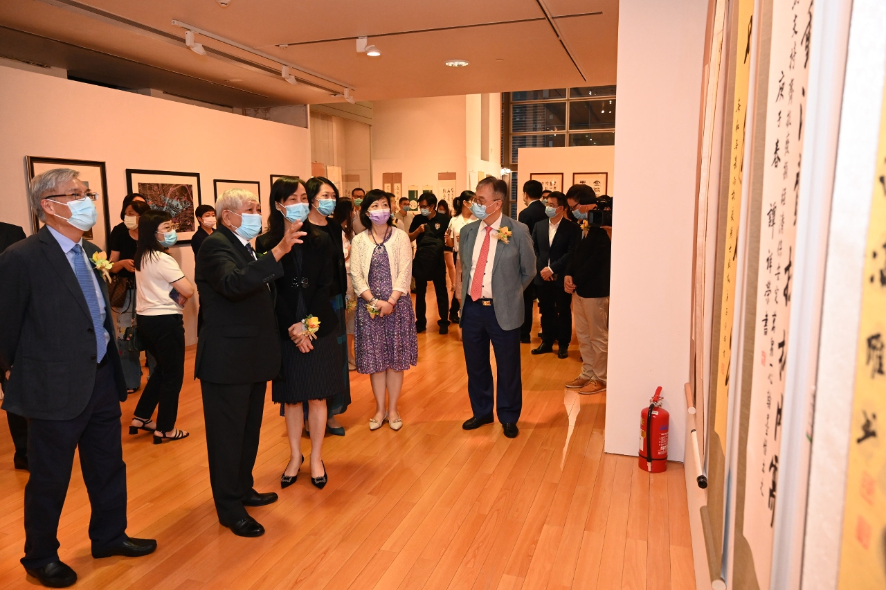 由文化局与中央人民政府驻澳门特别行政区联络办公室宣传文化部联合主办的“文化抗疫莲一心—澳门美术作品展”于7月8日(星期三)下午6时30分在澳门回归贺礼陈列馆举行揭幕仪式。仪式由澳门特别行政区政府社会文化司司长欧阳瑜、中央人民政府驻澳门特别行政区联络办公室副主任严植婵、澳门特别行政区政府文化局局长穆欣欣、中央人民政府驻澳门特别行政区联络办公室宣传文化部部长万速成、澳门颐园书画会会长崔世昌、澳门日报社长陆波、澳门广播电视股份有限公司执行委员会主席白文浩、澳门美术家协会主席黎鹰、澳门美术协会会长陆曦、澳门智慧人文励政会会长吴在权、澳门书法篆刻协会会长萧春源、松风文化艺术协会会长苏鉴良、澳门水墨艺术学会会长麦理、美术纵横社长刘富业主礼。