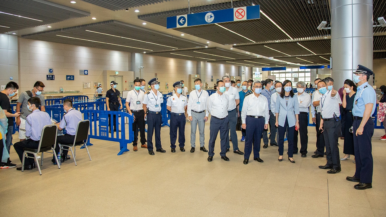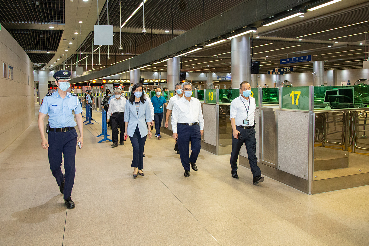 两司长及一行官员首先视察了关闸广场离境人流的管理措施,并瞭解通关人士转换健康码及离境大堂检查健康码的分流情况,以及就市民和外地雇员转码后的通关便利,提出了优化建议。