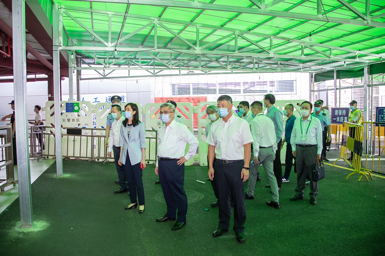 为进一步优化转换健康码通关流程及完善通关措施。于今天(12日)下午,保安司司长黄少泽、社会文化司司长欧阳瑜、警察总局局长梁文昌、海关关长黄文忠、治安警察局局长吴锦华、卫生局局长李展润、科学技术发展基金行政委员会委员陈允熙等官员前往关闸出入境事务站进行实地视察及作出工作指导。