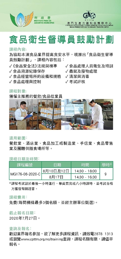八月份「食品卫生督导员课程」现正接受报名,报名日期至七月二十七日,欢迎有兴趣的食品业界参加。有关课程资讯或报名详情可浏览市政署食品安全资讯网www.foodsafety.gov.mo、澳门生产力暨科技转移中心网站 www.cpttm.org.mo/training ,或致电2878 1313查询。