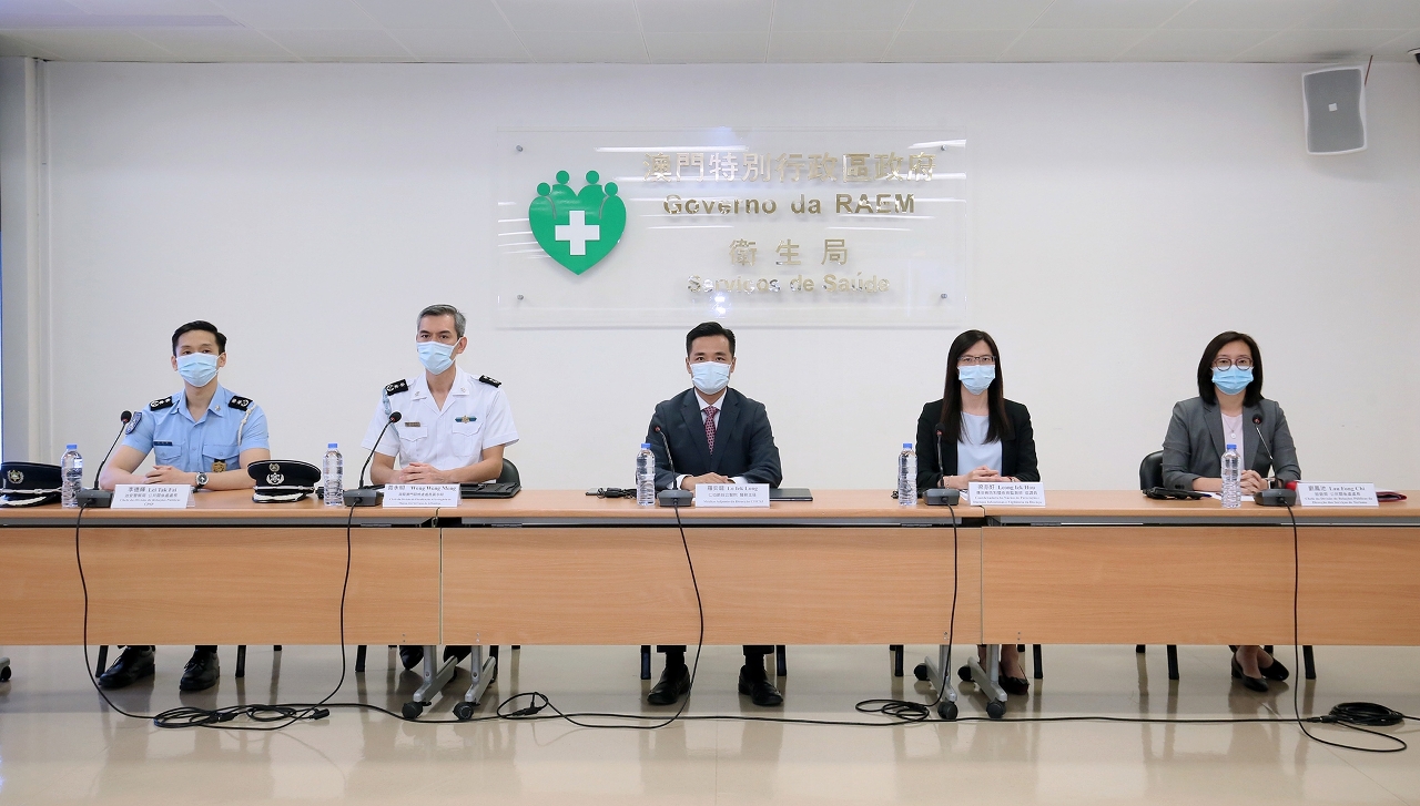 新型冠状病毒感染应变协调中心(下称应变协调中心)于今(24)日举行例行记者会,仁伯爵综合医院罗奕龙医务主任、海关澳门关检处黄永明处长、治安警察局公共关系处李德辉处长、旅游局公共关系处刘凤池处长、疾病预防控制中心传染病防制暨疾病监测部梁亦好协调员共同会见传媒。