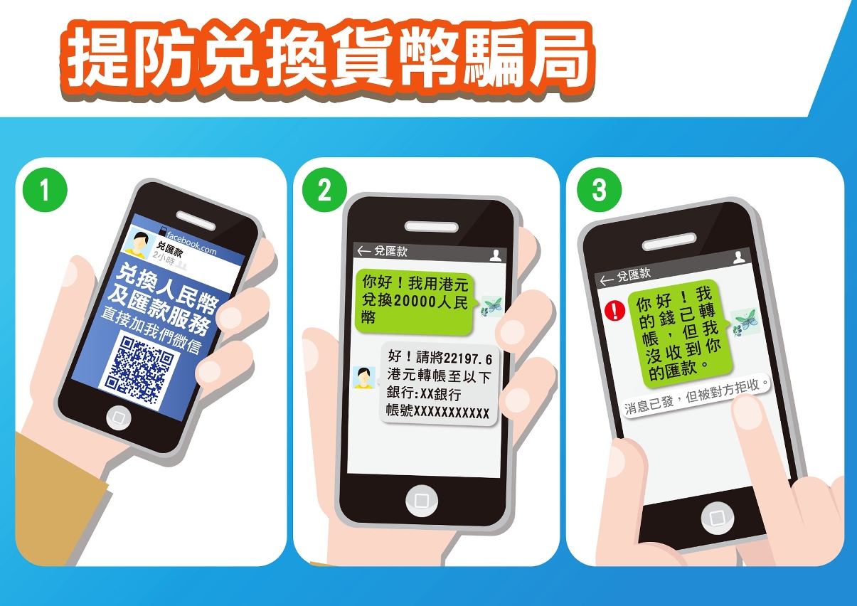 - 事主于某网络社交平台发现一则贴文,声称可以兑换人民币,并提供内地汇款服务;