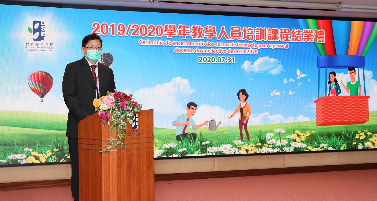 为了与教学人员共同分享完成培训的硕果与喜悦,同时藉此鼓励教学人员持续进修,为教育质素不断的提升作出贡献,教青局于7月31日下午6时在总部一楼仲尼堂举行了“2019/2020学年教学人员培训课程结业礼”。教青局局长老柏生、中央人民政府驻澳门特别行政区联络办公室教育与青年工作部副部长苟人民、教青局副局长梁慧琪及龚志明,以及培训课程的学员代表,合共约40人出席。