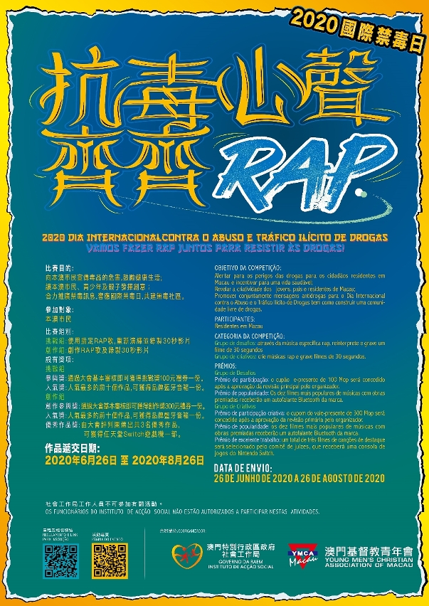「抗毒心声齐齐RAP」活动是本年度国际禁毒日系列活动之一,鼓励参赛者以大会指定禁毒歌曲「正路」进行重新演释或重新创作,并录制成30秒以内的禁毒RAP歌短片。参赛作品通过审核后将发布至澳门基督教青年会FACEBOOK专页“YMCA MACAU”并接受网上投票。符合规定的参赛者除可获得参与奖外,更有机会竞逐网上人气奖。评判团亦会对重新创作的禁毒RAP歌短片进行评审,选出优秀作品奖。