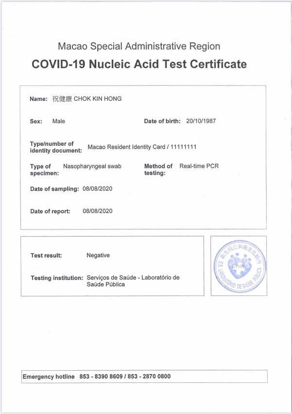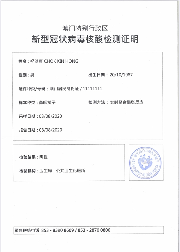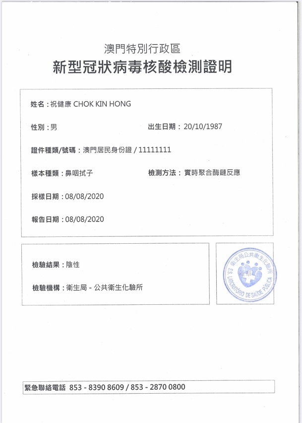 新型冠状病毒感染应变协调中心表示,由明(12)日开始,澳门居民可获豁免隔离医学观察进入广东省以外的中国内地省份。经各粤澳口岸进入广东省的市民可按规定凭澳康码转换粤康码及其核酸检测结果信息即可通关,如市民需要乘搭飞机前往广东省以外的中国内地、台湾地区或其他国家而需纸质病毒核酸检测报告,市民可向本澳检测机构申请纸质证明。检测单位提供的纸质报告有中文繁体、中文简体、葡文和英文四种文字可供选择(见附图),市民可在申请报告时选择申请所需的文字版本。