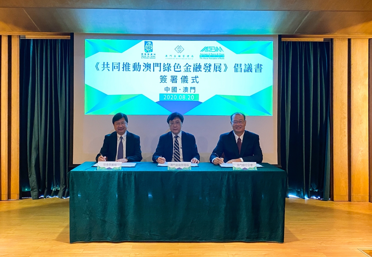 澳门金融管理局、环境保护局及澳门银行公会今天(20日)签署了《共同推动澳门绿色金融发展》倡议书(下简称《倡议书》),支持澳门经济朝多元、绿色及可持续发展的方向推进,提升本地金融产品在粤港澳大湾区及国际市场的竞争力和吸引力。