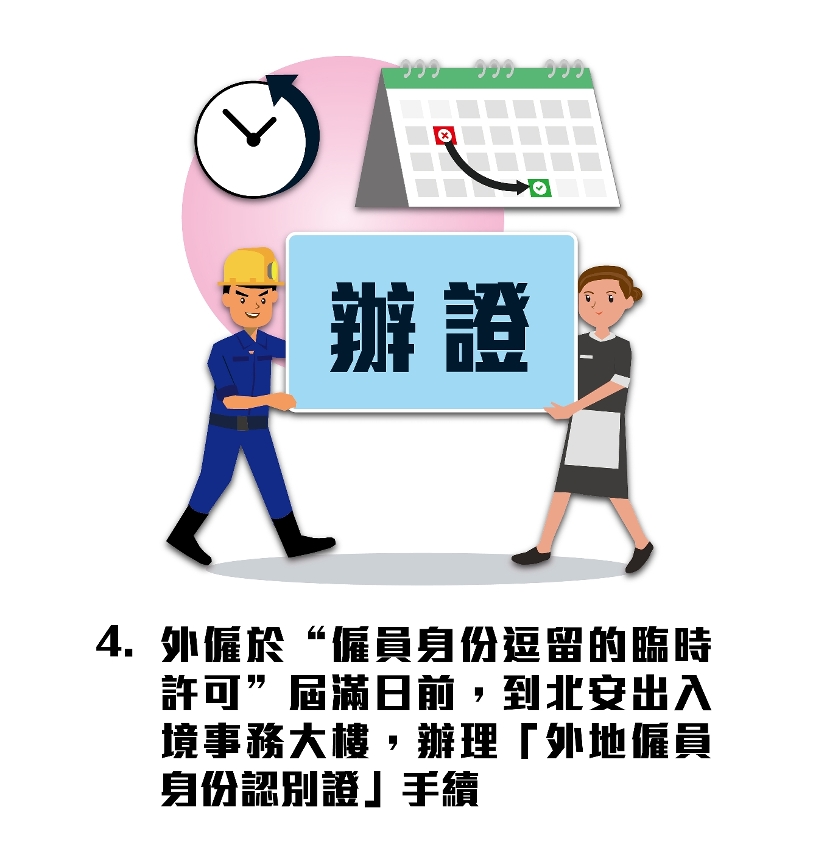 相关法律修改后,来澳从事非专业及家务工作的非居民,于持“以工作为目的的入境凭证”入境澳门时,会获发“雇员身份逗留的临时许可”,雇主与雇员之间的劳动关系随即建立。其后,外地雇员须于相关“临时许可”届满日前,前往北安出入境事务大楼办理“外地雇员身份认别证”手续。此外,需预先申办澳门签证之国家(包括孟加拉、尼泊尔、尼日利亚、巴基斯坦、斯里兰卡及越南)的国民,除持有“以工作为目的的入境凭证”外,还须预先经中国驻外使领馆申办到澳门签证,方可入境澳门工作。