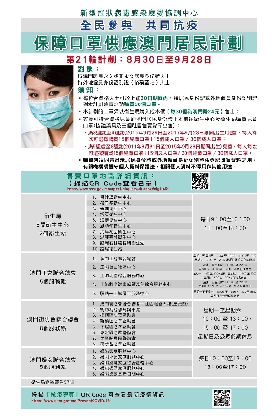 新型冠状病毒感染应变协调中心今(27)日公布,第21轮保障口罩供应澳门居民计划于周日(30)日开始,售卖期间为30日,即8月30日至9月28日,期间每人可一次性购买30个口罩,售价合共24澳门元。应变协调中心强调,特区政府保证口罩供应充足,市民在第21轮计划期间的任何时间都可购买到口罩,呼吁市民毋需急于首两日前往购买,以避免人群聚集,届时亦无需长时间轮候,希望市民配合。
