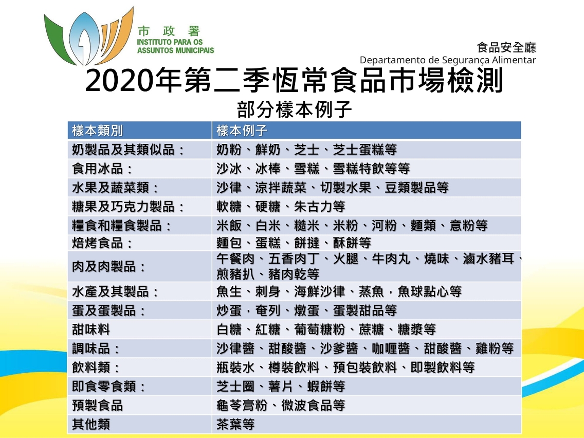 为保障消费者的食用安全,巿政署食品安全厅依据目前流通市场的食品种类和特点,制定各类型的食品调查抽样计划,包括“常规食品调查”及“食肆食品调查”计划,进行化学、微生物学及辐射水准等检验。抽样调查的范围包括本澳各区之超级市场、杂货店、百货公司、饮食场所及外卖店等,抽取各类即食食品、饮品、粮油食品、零食等。本年第2季合共抽取695个样本,所有样本的检测结果均未见异常。