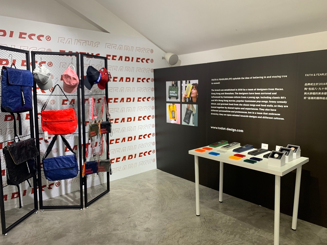 FAITH & FEARLESS成立于2016年,先后获内地及外国多项设计大奖,设计团队成员来自内地、香港及澳门。展场以设计独特的时尚饰品和潮流手提袋为主,产品材质多样,包括编织、迷彩、绦纶及PVC等,用色大胆鲜明,以玩味和前卫设计吸引时尚潮人,也为观众带来创新的视觉观感。