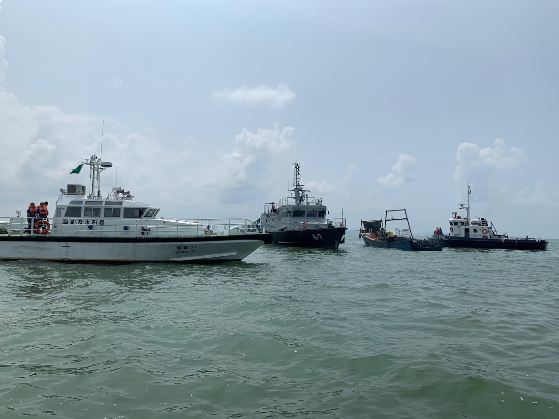 肇事渔船由于船尾被烧毁受损,并出现严重入水情况,现时已经沉没。两地船只仍在戒备当中,局方会协助跟进善后工作。