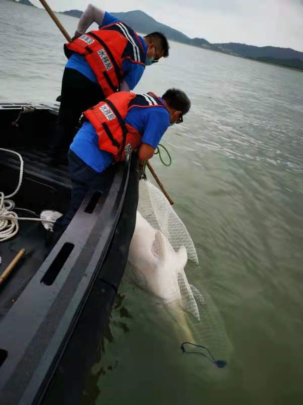 海事局派船把海豚尸体拖回岸边