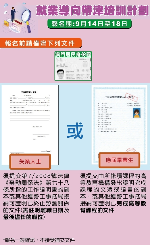 根据第33/2020号行政法规,于二零一九年一月一日或之后因劳动关系终止而失业的人士,以及非处于受雇状态的二零二零年高等院校毕业生,均符合条件报读“就业导向带津培训计划”。