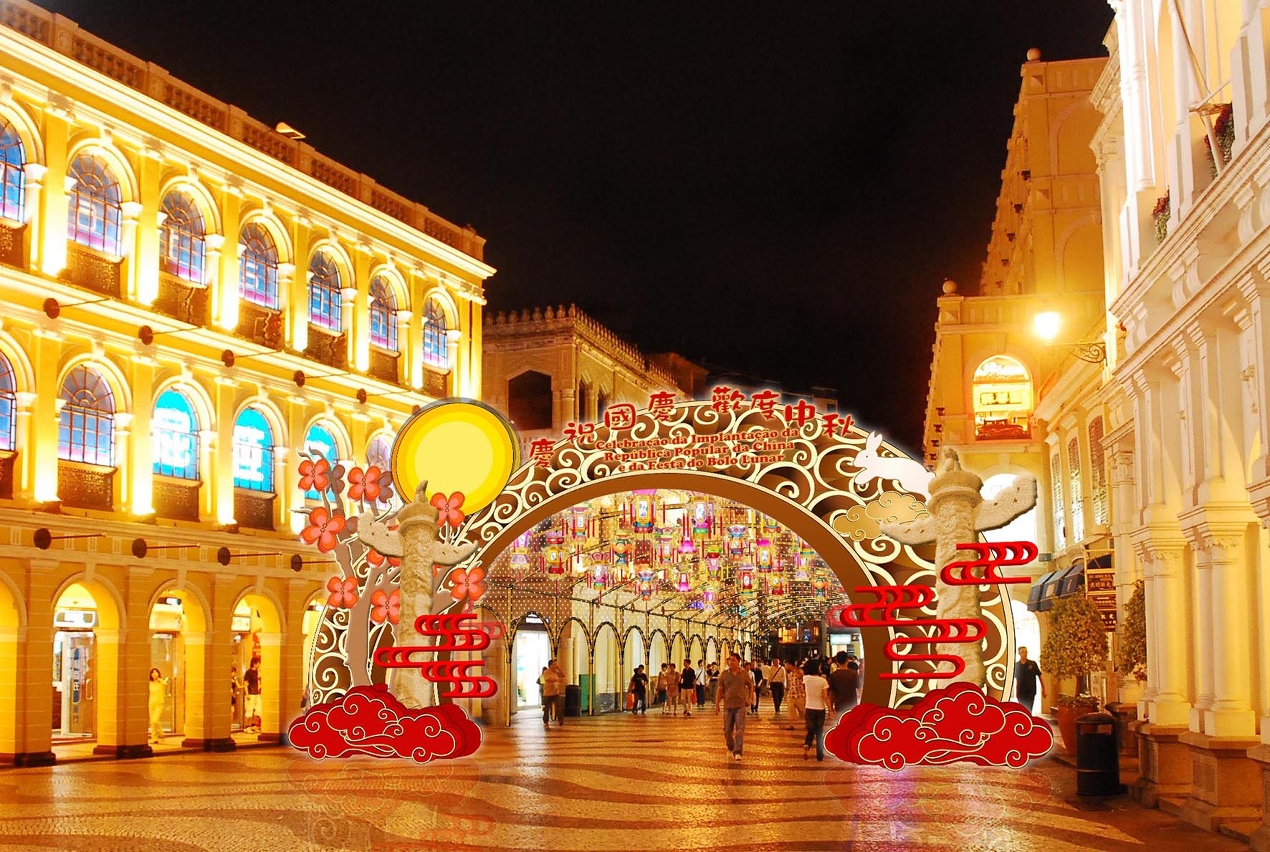 国庆及中秋佳节将近,为增添节日的欢乐气氛,市政署在澳门各主要街道、广场、公园、圆形地及富有特色的建筑物布置节日灯饰。今年国庆日适逢中秋正日,故在灯饰设计上亦加入国庆的主题元素,让灯饰更多元化,更具节日气氛,与市民欢度中秋佳节及共贺国庆。