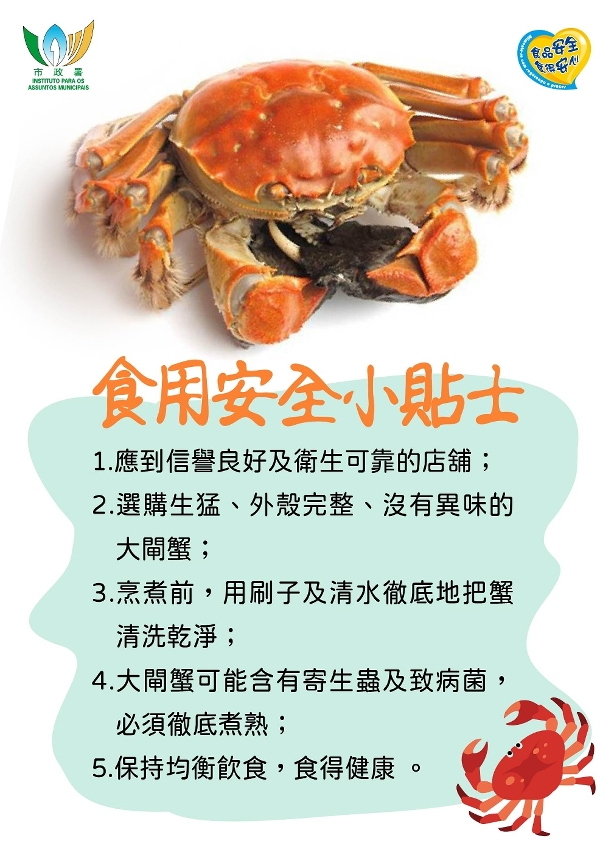 消费者在选购大闸蟹时,应到信誉良好及卫生可靠的店铺,切勿单凭网上广告图片便决定选购,购买前须清楚货品来源;另外,应选购生猛、外壳完整有光泽、没有异味的大闸蟹,一旦蟹只死亡,容易产生大量微生物,有机会影响健康,不宜继续烹煮食用。倘消费者对大闸蟹来源存疑或经非正途运入本澳出售,可致电食安热线2833 8181举报。