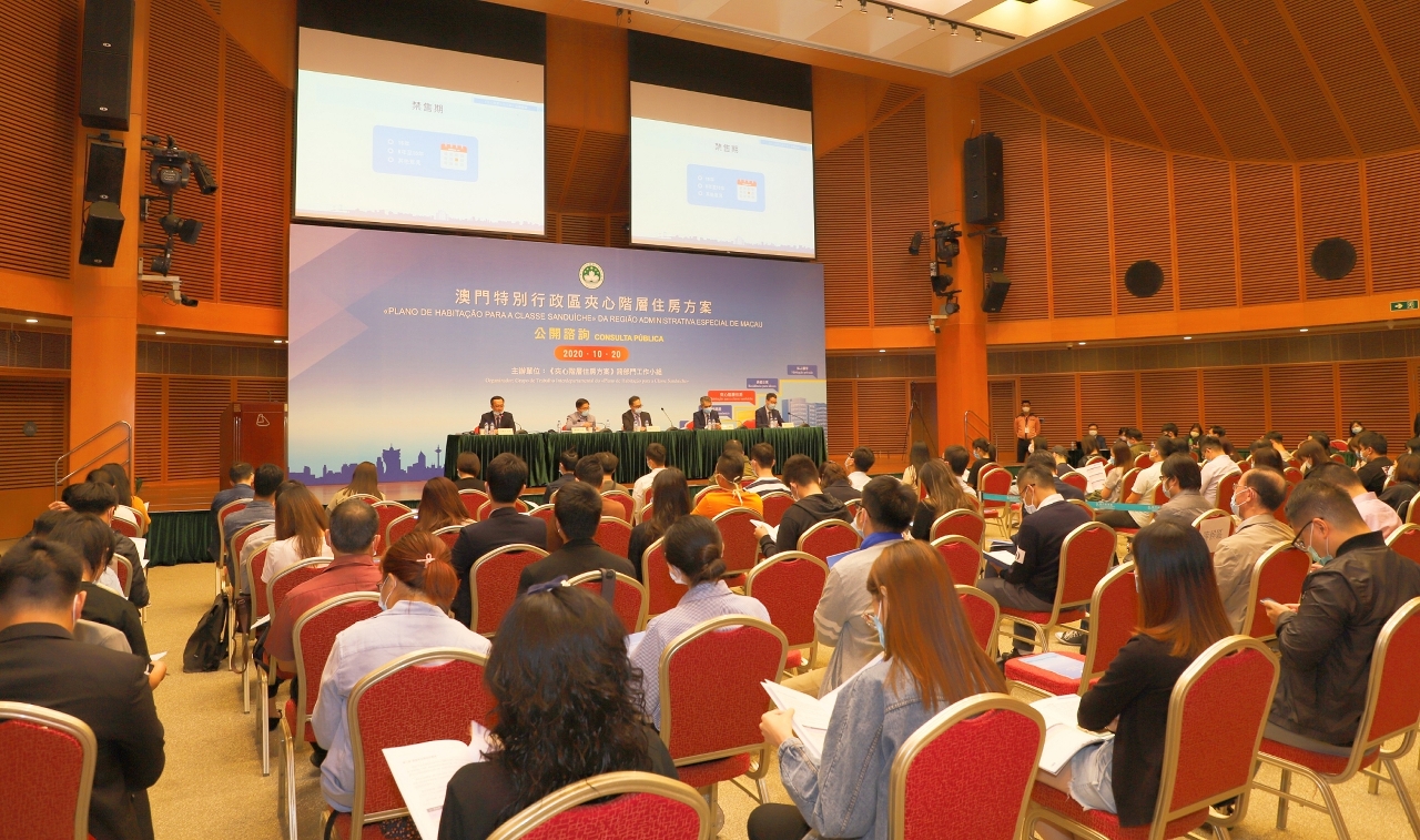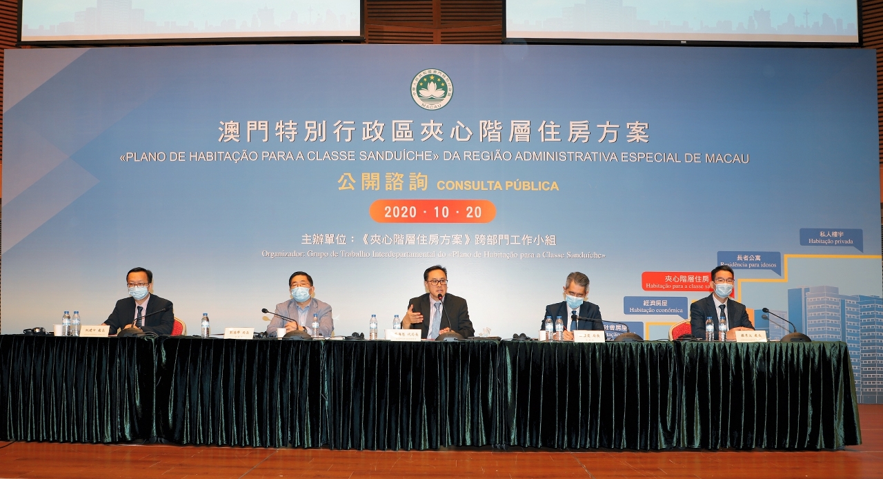为落实行政长官和特区政府提出的“阶梯房屋政策”理念,协助解决社会关注的夹心阶层置业困难问题,特区政府跨部门工作小组拟定了《夹心阶层住房方案》并于10月13日至12月11日期间开展社会公开咨询活动。跨部门工作小组今日(20日)晚间在澳门科学馆会议厅举行首场社会公众咨询会。工作小组成员政策研究和区域发展局代局长吴海恩、法务局局长刘德学、房屋局局长山礼度等出席咨询会。约100位社会人士参加了咨询会,共有19位社会人士在现场先后发言。