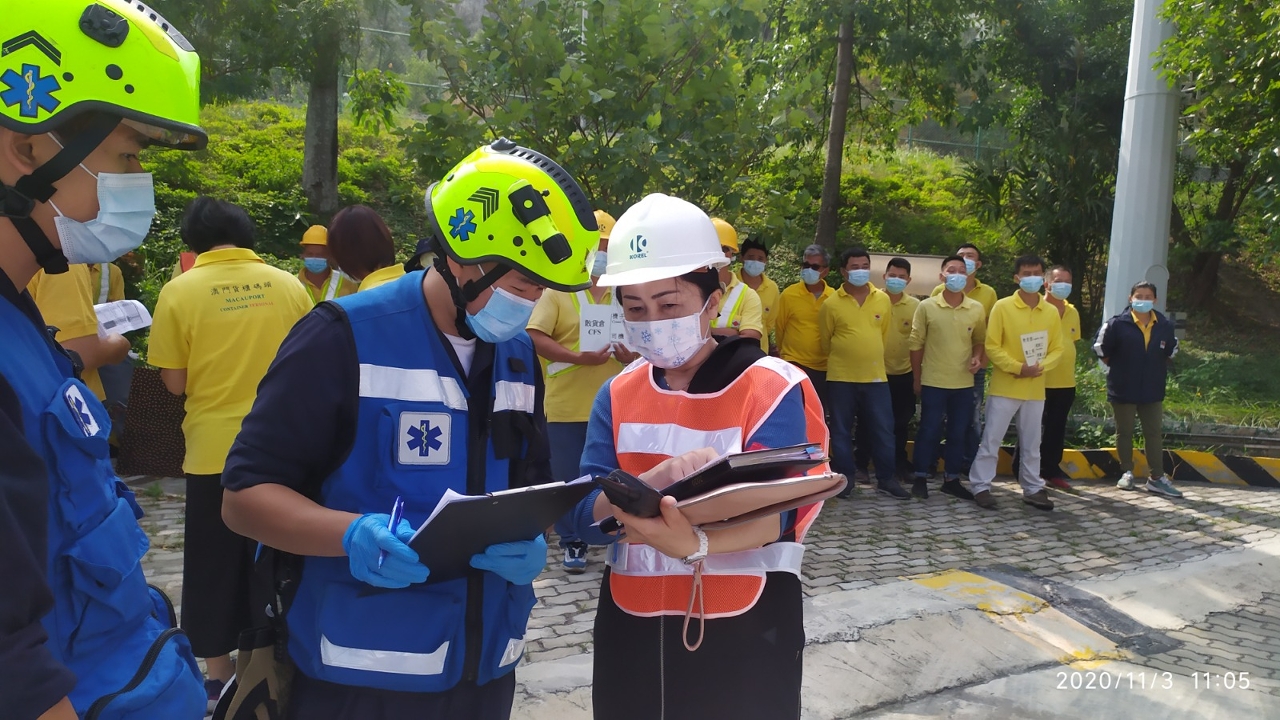为加强与澳门货柜码头有限公司在发生紧急事故时的应急救援工作及协调沟通机制,消防局于本年11月03日上午,联同上述机构在九澳货柜码头举行起卸事故演习。