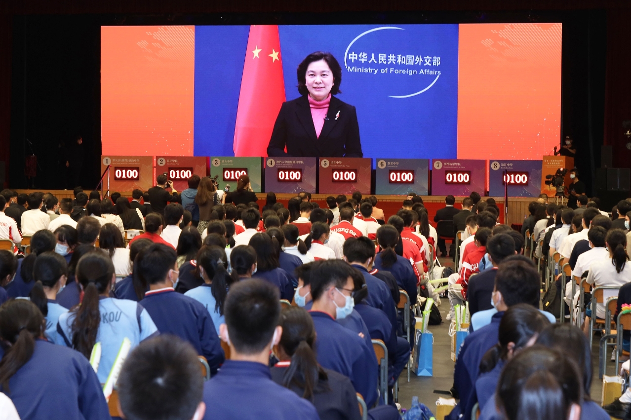 参加竞赛的学生关注新冠疫情对国际的影响,思考全球一体化、构建人类卫生健康共同体的意义和必要性,并瞭解国家成功抗疫及对全球抗疫支援的贡献。经过9月19日的初赛,8支队伍从35间学校中脱颖而出晋身总决赛。总决赛当天,在配合防疫措施下,出席的包括各校校长、老师和同学,为参赛同学打气,气氛热烈。竞赛前,十分荣幸获得国家外交部发言人、新闻司司长华春莹特别透过视频致辞,鼓励学生多认识国家的发展以及国际形势,还有社会文化司司长欧阳瑜和外交部驻澳门公署署理特派员王冬致辞,勉励学生把握学习机会,抓紧国家快速发展的机遇,为国家实践构建人类命运共同体作充足准备,未来共同展现中国精神、中国力量、中国担当。