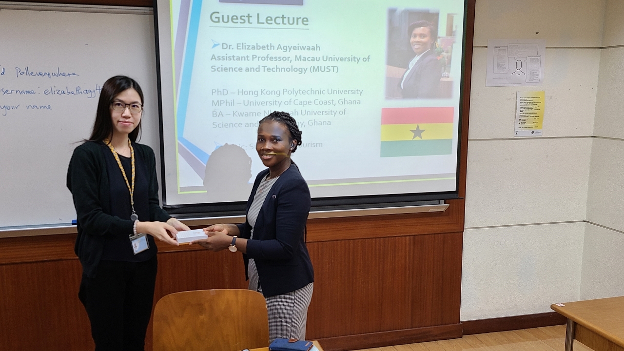 2020年11月19日,澳门旅游学院(IFTM)邀请澳门科技大学助理教授Elizabeth Agyeiwaah博士到访学院,就旅游业的可持续发展发表演讲。是次演讲由澳门旅游学院酒店管理课程讲师李雪莹博士为就读一年级酒店管理专业的学生安排的。