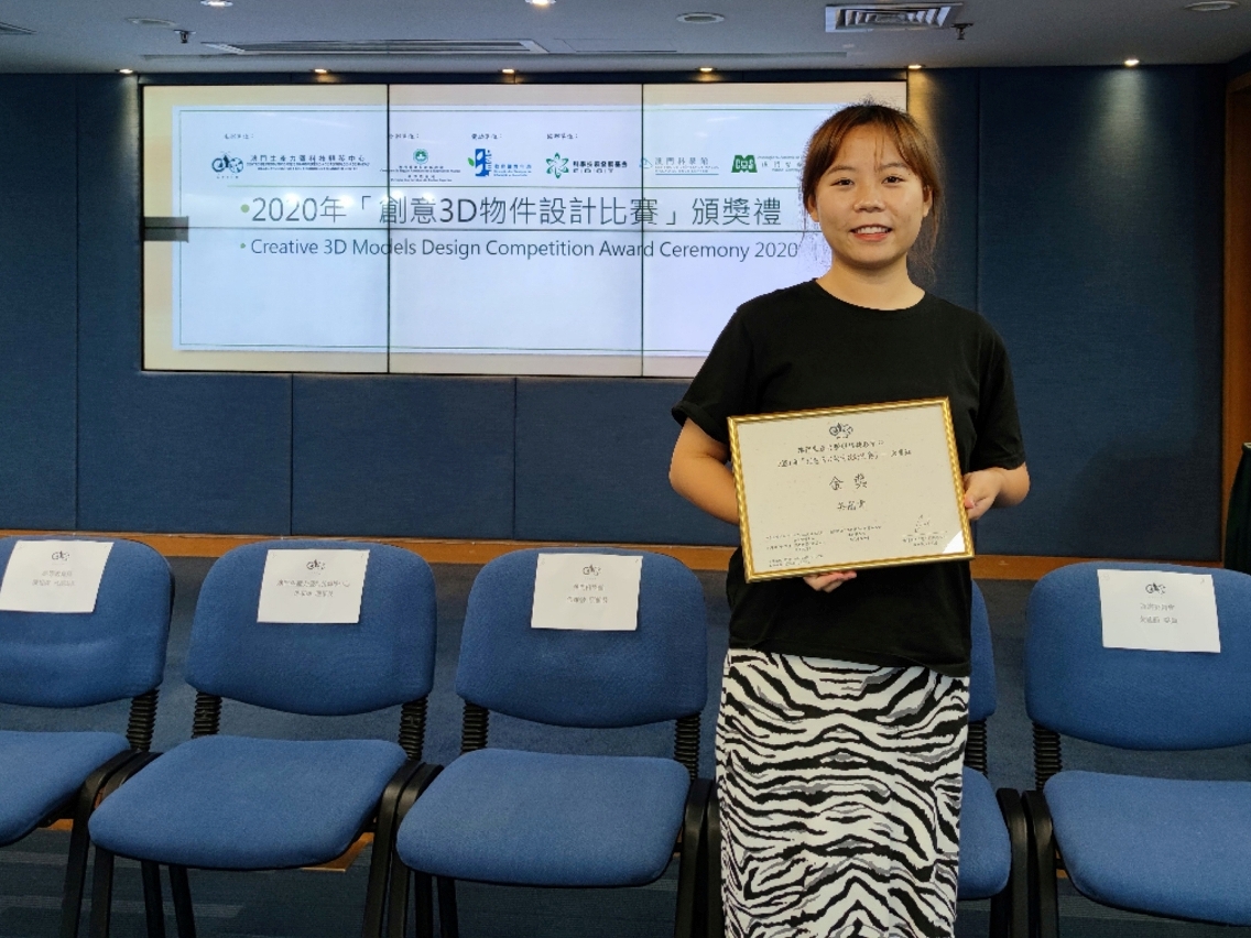 澳门理工学院跨领域艺术硕士学位课程学生吴圆书和设计学士学位课程学生梁行行,日前参加由澳门生产力暨科技转移中心主办的2020年“创意3D物件设计比赛”,分别夺得大专组金奖和银奖,并于颁奖礼上分享创作理念。