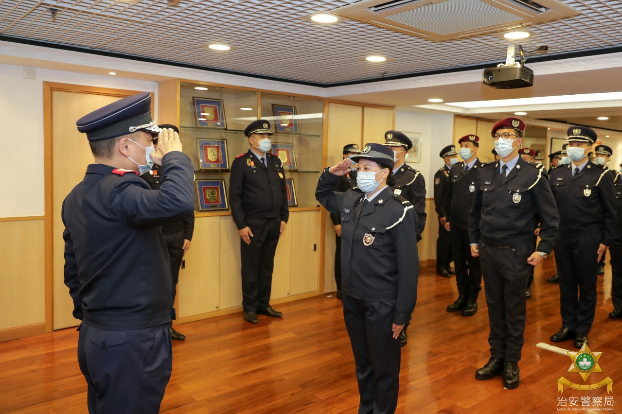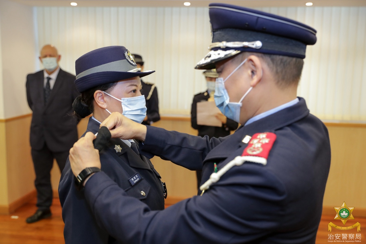 仪式简单而庄重,出席的领导和各部门主管为获晋升警长戴上新肩章,吴锦华局长表达祝贺并勉励他们在职涯的新阶段,尤其面对目前严峻的抗疫形势,要发挥警队中坚力量的作用,带领前线人员团结一致,以主动的态度、创新的精神、积极的步伐,不断提升自身能力和专业水平,以应对社会的新挑战,为保障澳门社会的稳定和广大市民的安全积极作出贡献!