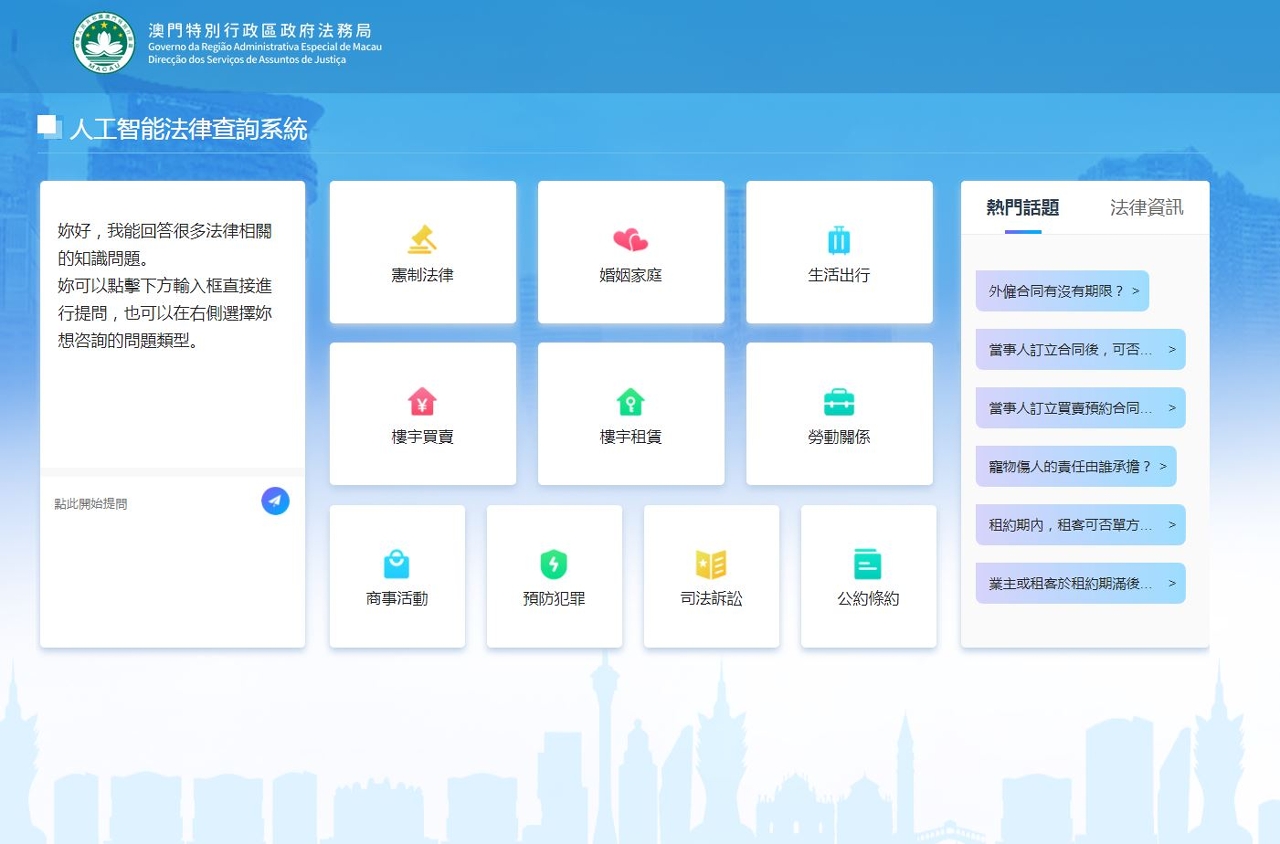 为向市民提供更好的法律资讯服务,法务局将运用AI技术,推出“人工智能法律查询系统”,提供包括宪制法律、婚姻家庭、生活出行、楼宇买卖、楼宇租赁、劳动关系、商事活动、司法诉讼、预防犯罪和条约等法律资讯,24小时全天候供市民使用及查询。