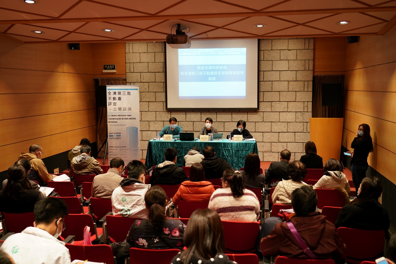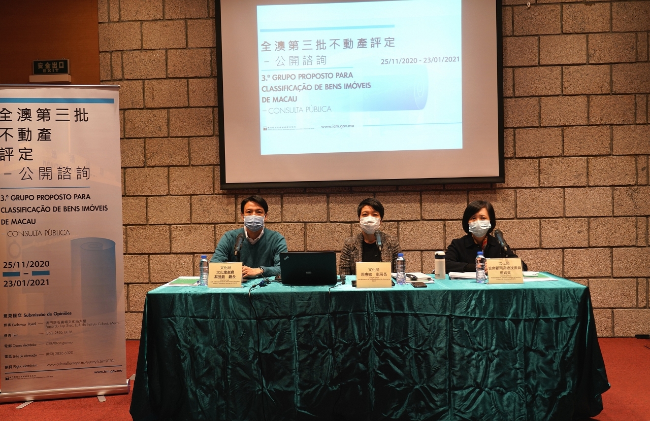 为发掘及保护本澳具重要文化价值而未列入“文物清单”的不动产资源,文化局正开展《全澳第三批不动产评定》工作,并于2020年11月25日至2021年1月23日期间进行为期60天的公开咨询,期间举行三场公众咨询会。今日(12月19日)在澳门博物馆演讲厅举行最后一场公众咨询会,由文化局副局长梁惠敏、文化遗产厅厅长蔡健龙、首席顾问高级技术员崔贞贞出席,向市民讲解咨询内容并听取意见。