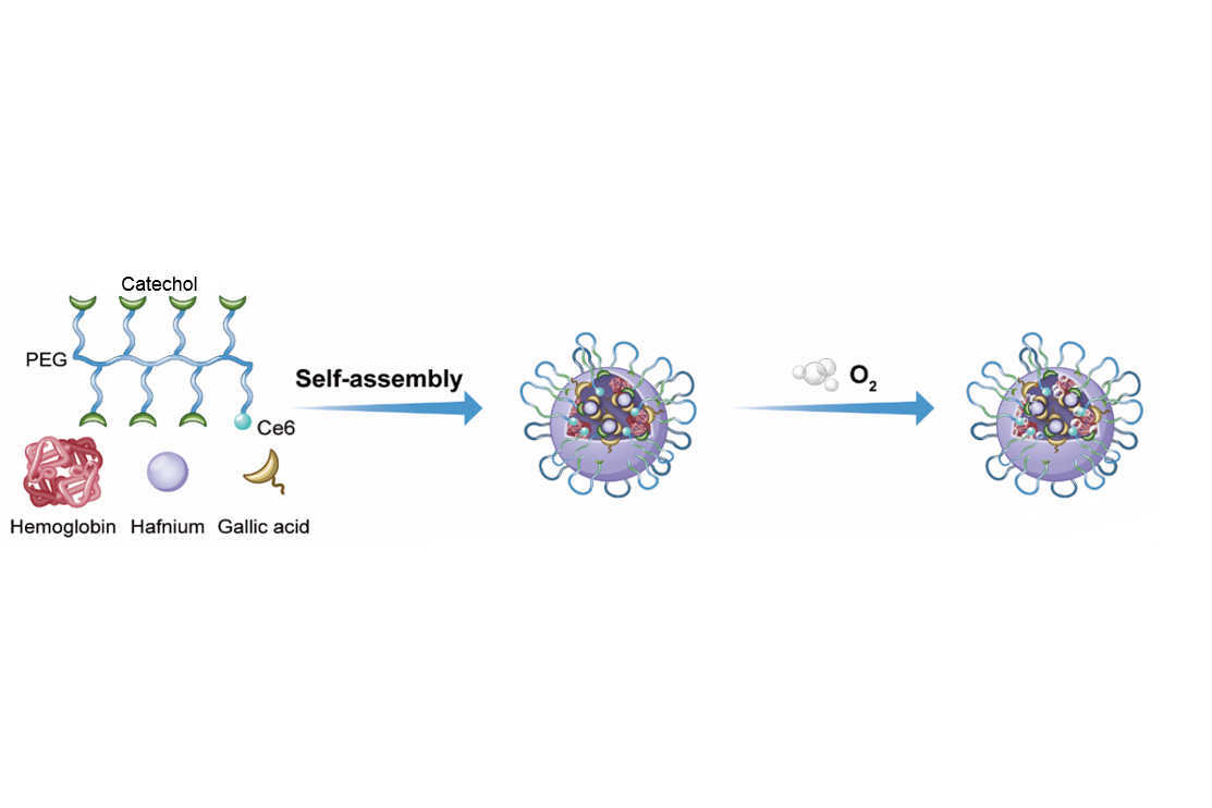 Hb@Hf-Ce6纳米粒子基于金属多酚配位的结构,将所有功能分子集成到纳米粒子中,实现多功能抗肿瘤效果。二氢卟酚e6(Ce6)修饰的多酚结构与高原子序数放疗增敏剂(铪,Hf)配位,氧载体血红蛋白(Hb)嵌合于配位结构中,克服与缺氧相关的耐辐射性。具体而言,在X射线辐射下,由Hf激发的放射诱导的物理过程可以启动光敏剂Ce6,从而产生高水准ROS诱导癌细胞损伤。