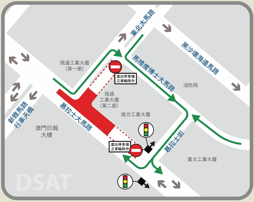 *车辆须经新辟临时路口取道马揸度博士大马路驶回原有路线 |