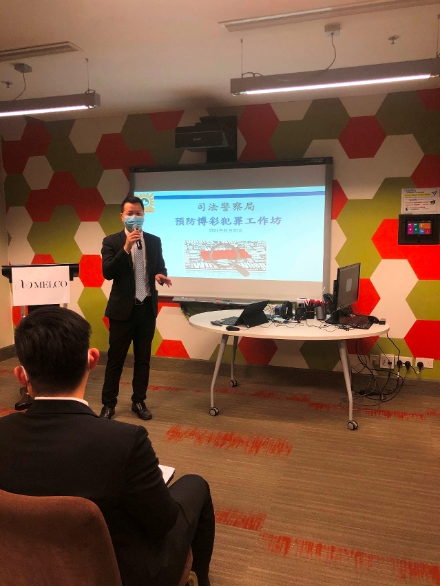 司法警察局持续与本澳博彩企业合作举办培训课程,增强前线工作人员预防与博彩相关犯罪的意识和能力。2021年1月20日,司警局与新濠博亚(澳门)股份有限公司合办“预防博彩犯罪工作坊”,教导前线工作人员如何防范与博彩相关的犯罪活动及配合警方工作,促进警民合作,共同防罪灭罪。