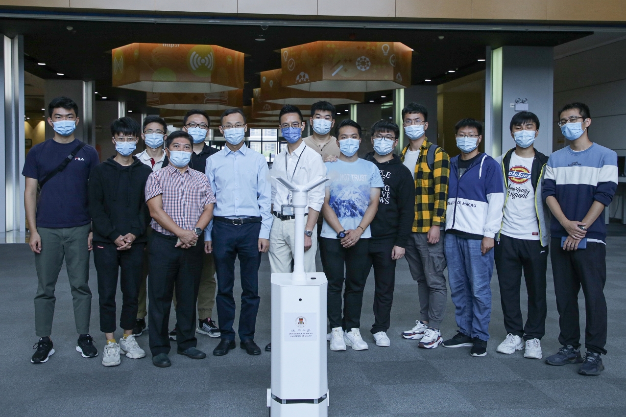 为减少前线人员的感染风险,澳门大学科技学院教授徐青松带领研究团队研发出低成本的消毒智能机器人——消毒智多星,替代消毒人员深入疫情严重的地方,实现空气和物表消毒灭菌。目前,该机器人已应用于镜湖医院门诊大楼、部分政府办公场所、澳大图书馆等,用家反应甚好且希望可以订制购买。