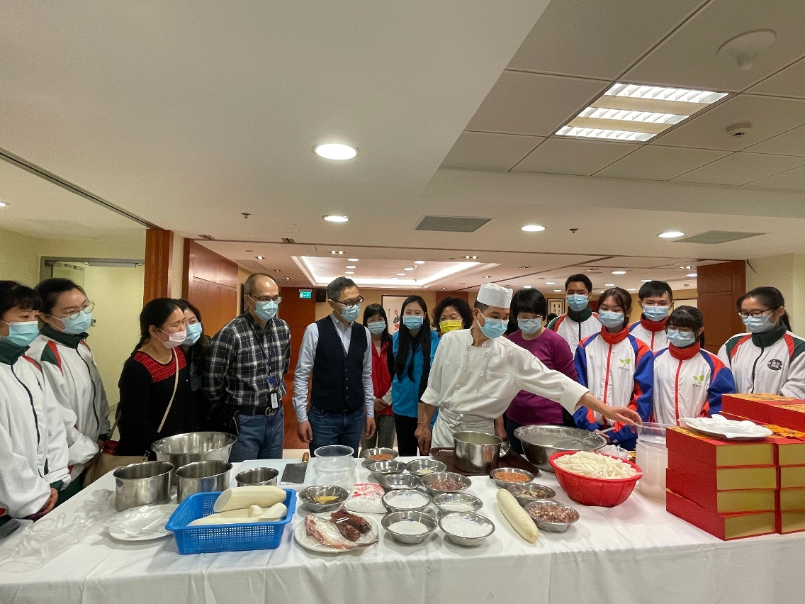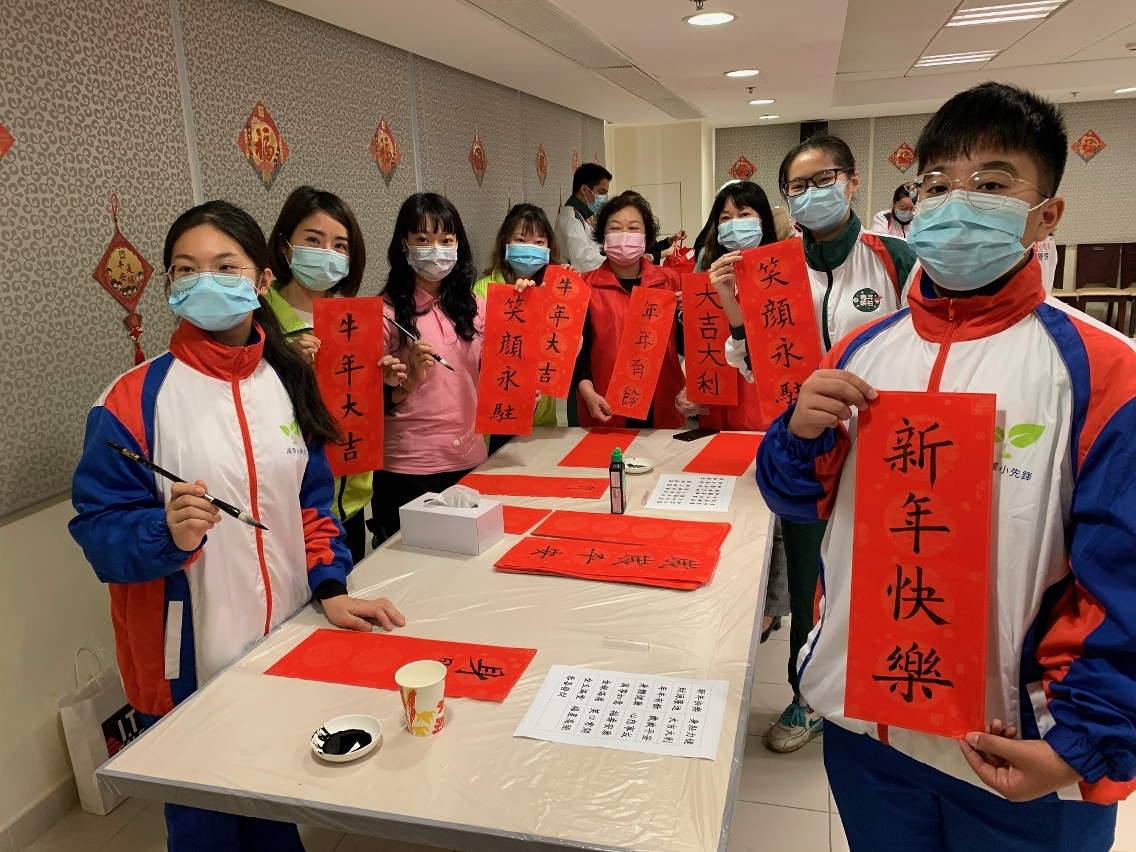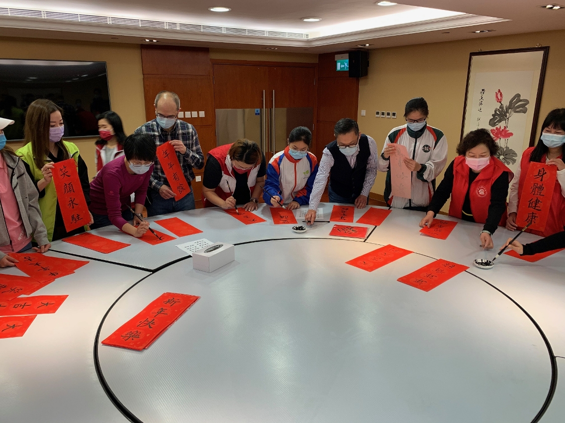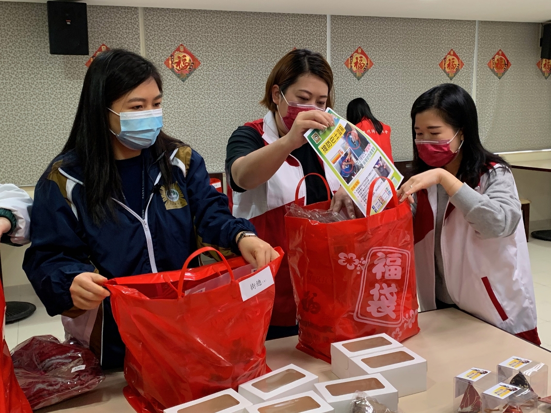 2月6日中午,在司警局总部大楼的员工餐厅内洋溢着欢乐热闹气氛,司警局人员联同二十多位妇女防罪之友会员、社区安全青年领袖及灭罪小先锋学员,在专业师傅的指导下认真、忙碌地制作贺年萝卜糕,并亲手写挥春,准备新春福包。随后,一行人前往路环石排湾公屋群探望该区的独居长者,将贺年萝卜糕和福包赠予长者们,提前向他们送上春节问候和祝福。
