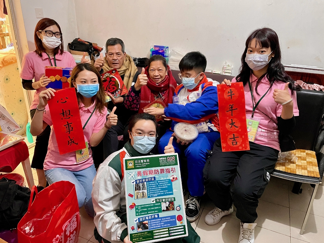 农历新年前夕,司法警察局联同“司警局妇女防罪之友”会员、社区安全青年领袖及灭罪小先锋学员前往路环石排湾公屋群探访独居长者,送上贺年糕点、福包和节日祝福,细心提醒长者们岁晚期间注意做好防罪措施。司警局冀透过是次活动弘扬敬老爱老精神,并向社会大众、尤其是年轻一辈传播关爱社会、和谐共融的正面信息。