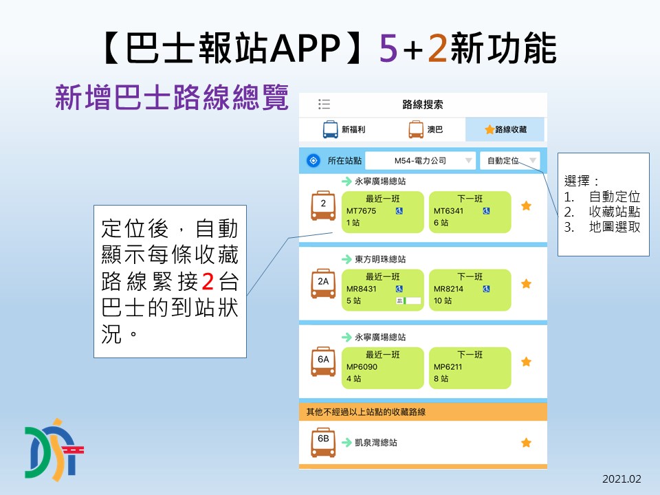 继去年巴士报站App新增及优化6项功能后,交通事务局今年2月初已推出5项新增及2项优化功能,务求更便捷市民出行。