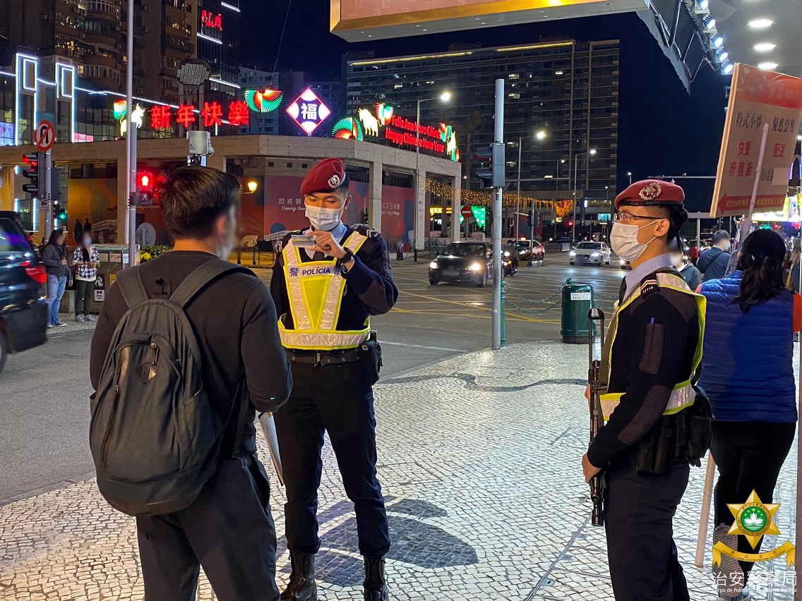 在警察总局统筹下,治安警察局持续进行“冬防行动2021”,确保本澳在春节期间保持良好的治安环境。于2月20日至21日,澳门警务厅、海岛警务厅、情报厅、交通厅及特警队联合警犬组共派出85名人员,分别在澳门北区、中区、新口岸区、氹仔市区及金光大道一带截查可疑人士,并巡查了多间宾馆、按摩店、网吧及游戏机中心,以预防及打击各种不法行为;同时也在各区进行查车行动,以打击醉驾药驾等违法行为。