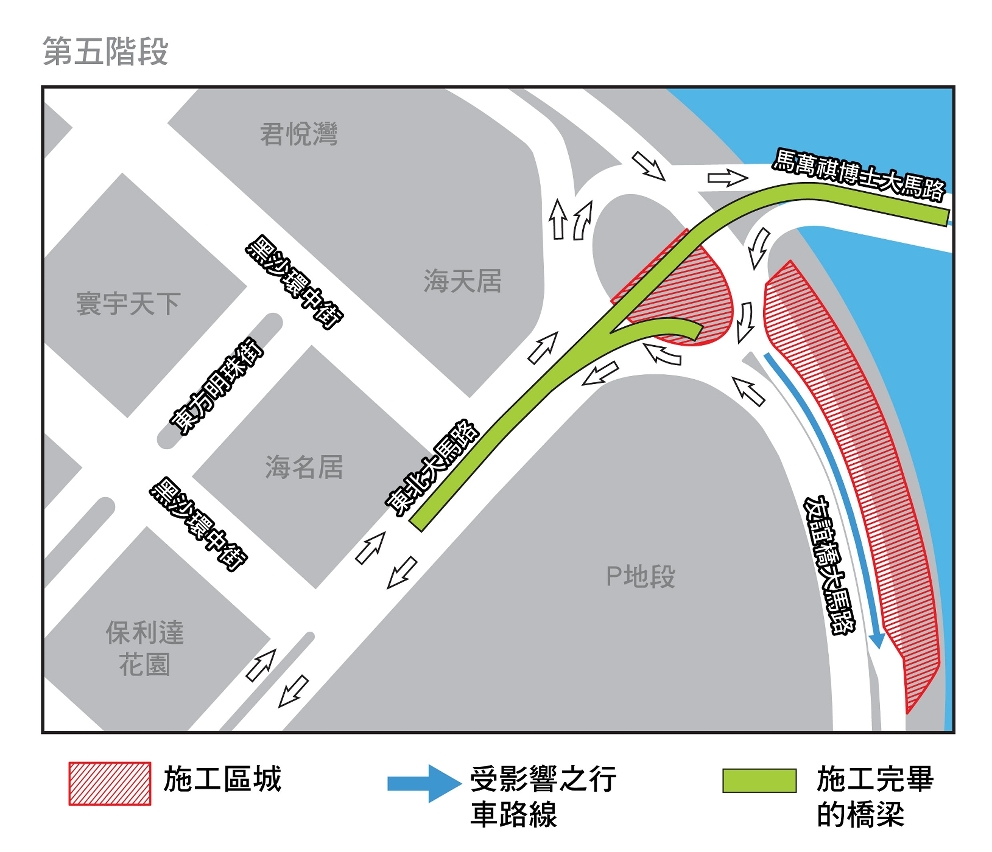 主体工程施工期间因应工程所需分阶段实施临时交通改道措施,工程范围包括友谊圆形地、友谊桥大马路、东北大马路及马万祺博士大马路,期间将善用友谊桥大马路侧休憩区,保持友谊桥大马路的行车方向和行车线数量不变,同时亦协调工程车辆不能在早上繁忙时段进入工地,减轻周边交通压力;首阶段只收窄马万祺博士大马路车行道,其他行车动线不变。但随着工程推进,东北大马路施工路段将维持每方向各二车道通车,并取消友谊桥大马路左转入东北大马路的专用车道,即该方向之车辆需按交通灯号行驶。当工程全面开展,东北大马路往友谊圆形地方向须改道至东方明珠街前往,并须按交通灯号行驶,届时将取消黑沙环中街、东方明珠街部份泊车位以扩阔行车道,减少车辆在区内造成挤塞,局方将视乎条件在合适位置增设时限性上落客货位及夜间泊车位。随着施工范围陆续减少,局方及施工单位将尽快恢复路面。此外,经与巴士公司协调,工程中后期,预计有10条巴士路线需要改道行驶,但不影响停靠站点。