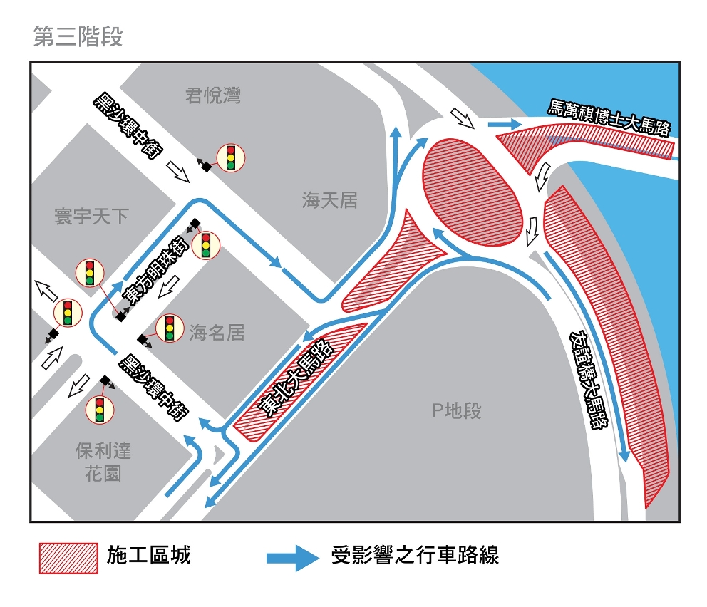 为减低对市民和交通之影响,交通事务局已于2019年10月进行超前钻工程,在行车天桥桩柱位置进行详细勘探,建设办则于2020年完成前期道路改造工程,扩寛黑沙环中街至友谊圆形地一段的东北大马路行车道及迁移地下管线,有助加快主体工程的兴建进度。