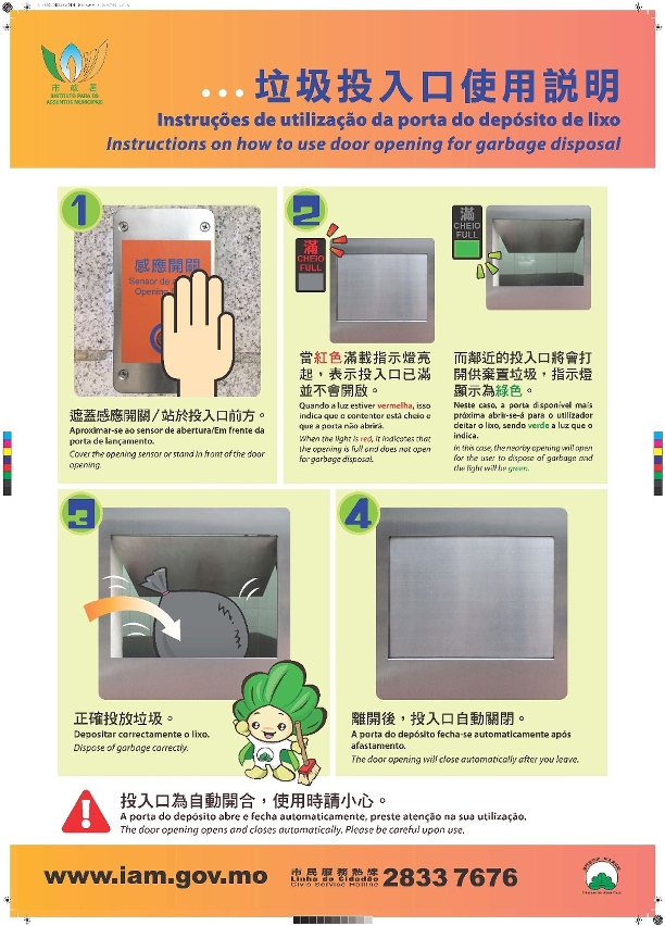 本年初巿政署已完成了全澳封闭式垃圾房自动投入口的升级改良工作,并已开放予巿民使用。同时,透过垃圾量数据的持续收集,亦可为未来垃圾收集设施和模式的优化提供数据基础,有助进一步的卫生环境优化研究。