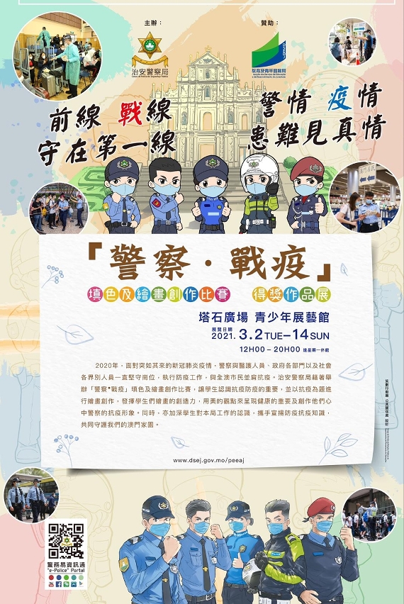 为唤起本澳青年关注社会各界在疫情下的防疫抗疫工作,并继续深化“警‧校联络机制”共同推进青年参与有益身心活动,治安警察局举办“警察‧战疫”填色及绘画创作比赛,冀让学生发挥自身绘画创作的潜能,以视觉艺术角度呈现警民坚守抗疫的精神,从中亦可加深他们对警队工作的认识,是次填色及绘画创作比赛共征集得约1,750份来自澳门中、小学的参赛作品。