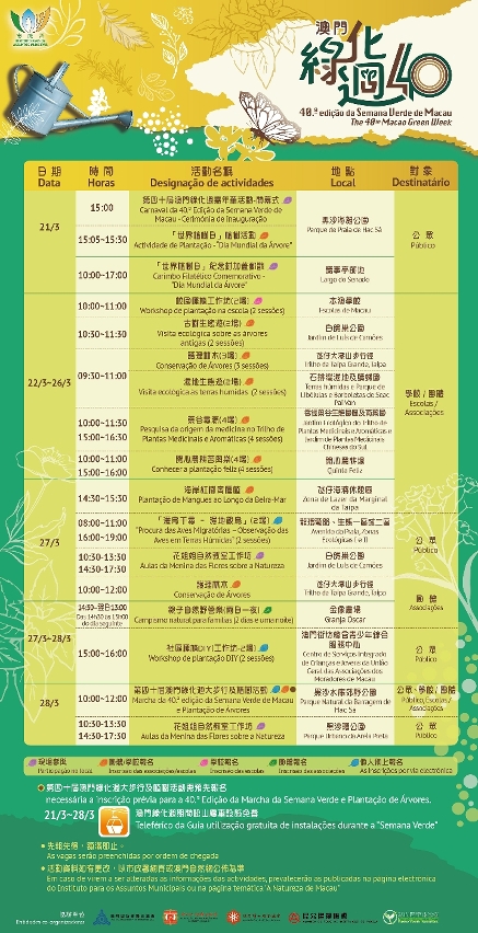 多年来,“澳门绿化周”致力推广生态教育、珍惜大自然、爱护绿化区和普及绿色休闲生活理念,见证着小城发展的同时,居民对环境绿化、生态保护的重视度日益提升。今届绿化周期间设有多项活动,供学校、团体及全民参与,当中现场参与的活动包括︰“第四十届澳门绿化周嘉年华”、“世界植树日”纪念封加盖邮戳、以及多场“全城爱绿─派送植物”活动。其他须提前报名的活动包括︰校园种植工作坊、古树生态游、护理林木、开心农耕苦与乐、湿地生态游、药谷寻源、社区种植DIY、“迁鸟千寻─湿地观鸟”及“第四十届澳门绿化周大步行及植树活动”等。活动内容精彩丰富兼具教育意义,欢迎有兴趣的学校、团体或市民报名参与。