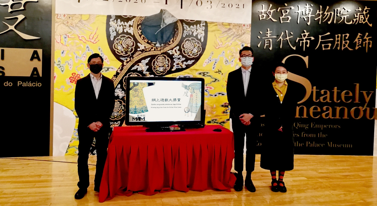 “一代昭度――故宫博物院藏清代帝后服饰”展自去年底于艺博馆举行,深受公众喜爱。为配合华丽多彩的服饰主题,艺博馆推出有奖游戏,其中“网上游戏大奖赏”共吸引近6400人次参与,今日在艺博馆由文化局文博厅厅长沈浩然、澳门日报副刊课主任陈蓥新,以及“一代昭度”展览统筹赵凯欣抽出幸运儿。头奖“仿明永乐青花五龙纹玉壶春瓶”由庄保文获得,二奖“兰堂富贵礼品套装”获奖者为司徒炜乐及唐容崧,三奖“云裳熙珠丝巾”获奖者为UN MIO I、FONG WAI CHAN及姜葶蔚,安慰奖名单可浏览艺博馆网页(www.MAM.gov.mo)。另一游戏“答中即抽即赏”亦吸引近450人次参与,市民可把握机会于展期内剪下不定期刊登于《澳门日报》之游戏表格,填上正确答案并到艺博馆接待处参加抽奖,游戏将于3月14日展览结束日完结。